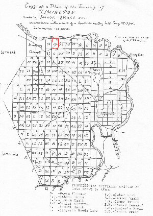 On October 7, 1774 the Ossipee Proprietors met and voted that 75 of the one hundred acre lots in Limington be drawn up on a map (drawn up by Joshua Small). Each lot was numbered, placed on separate pieces of paper and then drawn by chance so no one person would get the best lots. A likeness of Joshua Small’s map has been preserved and can be found at the Alfred Court House in Maine. (I have attached a jpeg copy of the 1774 map drawn by Joshua Small).